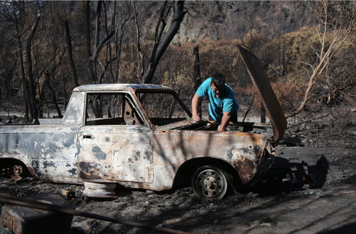 Un hombre junto a un auto quemado en el incendio forestal en Epuyén, Argentina, el 15 de enero. Foto Marcos Huisman