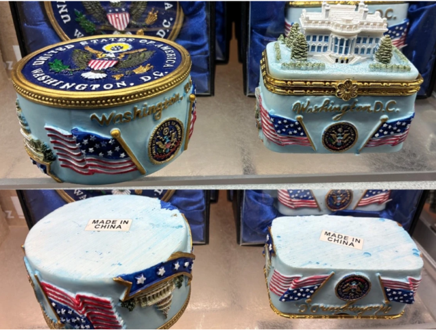En la tienda de regalos del Aeropuerto Nacional Reagan, a solo 15 minutos del número 1.600 de la Avenida Pensilvania, se ven maquetas de la Casa Blanca, el Capitolio o el sello estadounidense claramente marcadas como “Hecho en China”.
