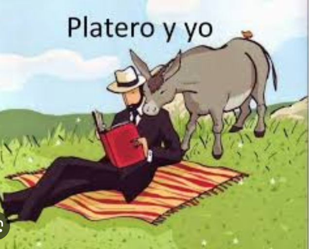 “Platero es pequeño, peludo, suave; tan blando por fuera, que se diría todo de algodón, que no lleva huesos. Sólo los espejos de azabache de sus ojos son duros cual dos escarabajos de cristal negro. Lo dejo suelto y se va al prado y acaricia tibiamente con su hocico, rozándolas apenas, las florecillas rosas, celestes y gualdas… Lo llamo dulcemente ¿Platero?, y viene a mí con un trotecillo alegre, que parece que se ríe, en no sé qué cascabeleo ideal…”