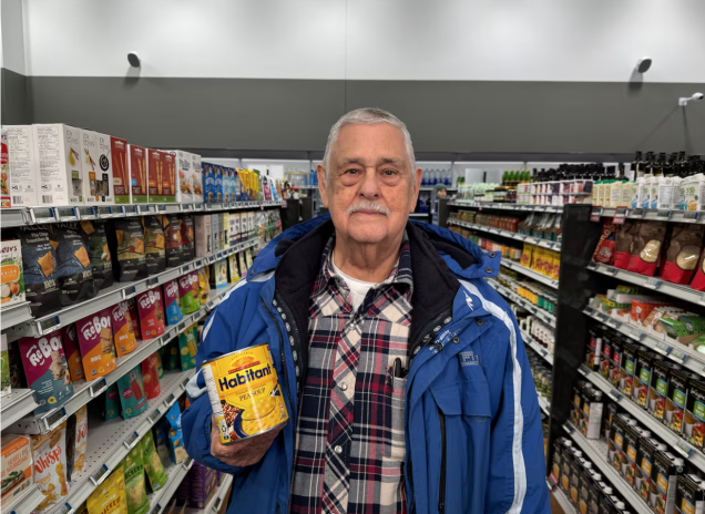 Bob Bastien, residente de Montreal, sostiene una lata de sopa francocanadiense de guisantes Habitant. (Foto Steph Kampf/CBC)