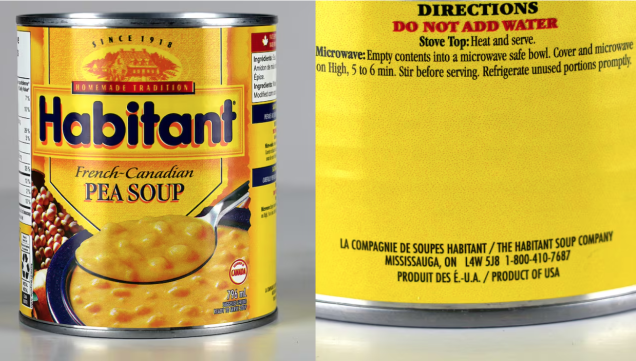 Otro ejemplo es la sopa de guisantes Habitant, una tradición francocanadiense con la frase “Diseñada en Canadá” en el frente. Pero al girar la lata, dice “Producto de EE. UU.”