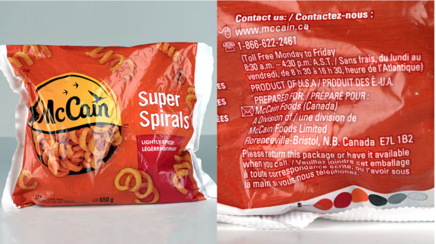 Los Super Espirales McCain indican en el reverso del paquete que son un producto estadounidense. (Foto David MacIntosh/CBC)