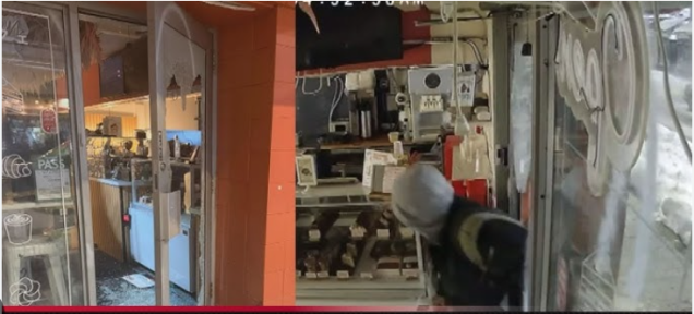 Las imágenes de seguridad muestran a un sujeto que aparentemente usa una herramienta para romper la puerta de cristal del café. Entra y procede a sacar dinero de la caja registradora mientras otro espera afuera, pero un empleado entra en ese momento.