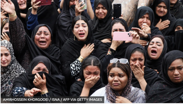 Hombres y mujeres vestidas con ropa oscura muestran su tristeza, algunas tienen en sus manos la foto del el ayatolá Alí Jamenei