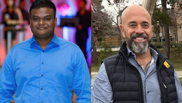 Chandan Kumar Raja Nandakumar, de 37 años (izquierda), fue asesinado el 7 de febrero en un tiroteo frente al centro comercial Woodbine. Sergio Lopes, de 65 años, fue asesinado a tiros unas semanas antes. Foto: Obituario y presentación de CityNews.