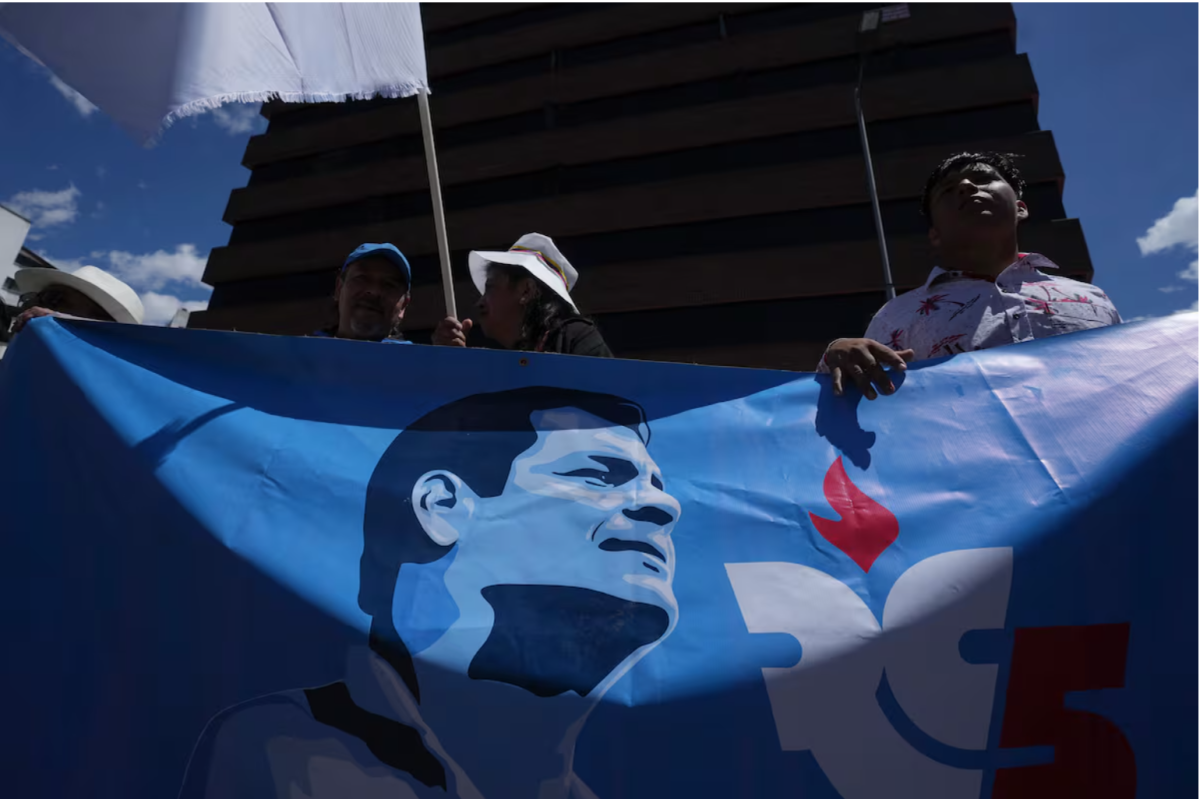 Partidarios del partido Movimiento Revolución Ciudadana sostienen una pancarta con la imagen del expresidente Rafael Correa, en noviembre de 2023. Foto Dolores Ochoa (AP)