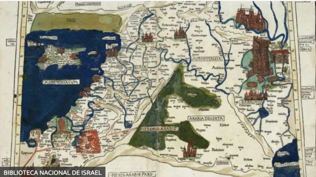 Mapa de Ptolomeo que muestra la región de la Luna Creciente Fértil (con ilustraciones adicionales dibujadas a mano en 1486).