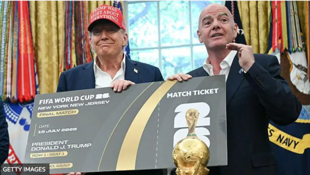 Fuente de la imagen,Getty Images. El presidente de la FIFA, Gianni Infantino, con el trofeo de 2026.
