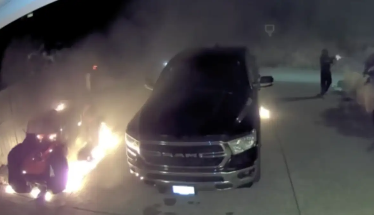 Una cámara de seguridad grabó las llamas saliendo de los vehículos mientras Kingra apuntaba con una pistola a la casa, disparaba 14 veces y huía en el auto que lo esperaba.